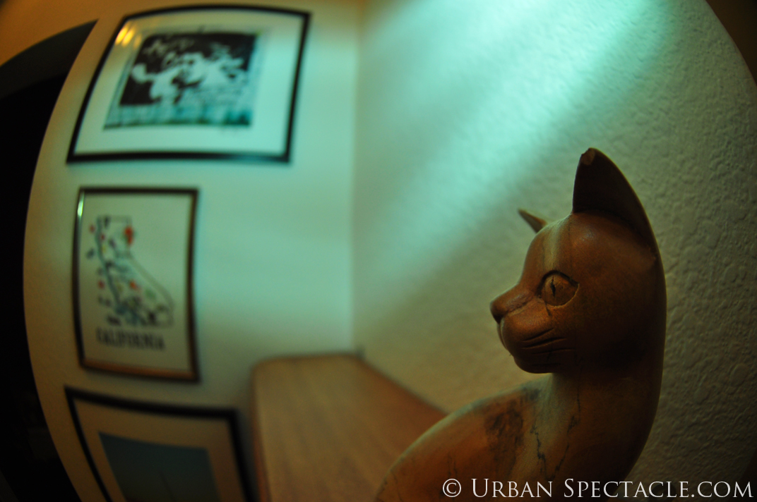 This cat is always watching over my front door and entryway. For this shot I played around with a flourescent/green filter for my flash – again, using the fisheye lens.